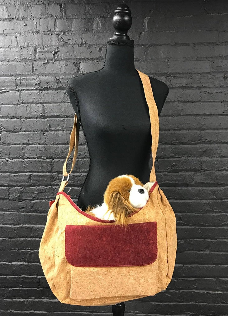 Keep your pet close while going hands free. Our natural sling is made from cotton canvas and trimmed with the bark of a cork oak tree, not the tree itself. Bark is harvested from the tree every 9-12 years. Completely renewable and sustainable, harvesting bark does not harm the tree. Each time cork is harvested; cork bark regenerates itself. Product features: Lightweight durable naturally harvested cork material. Removable interior leash strap. Flap snap pocket for human and pet needs. Adjustable shoulder strap. Natural cotton lining. One size: 14" W x 9" H x 5" D. For pets up to 12" long nape to tail, 7" high nape to floor. Up to 10 pounds.